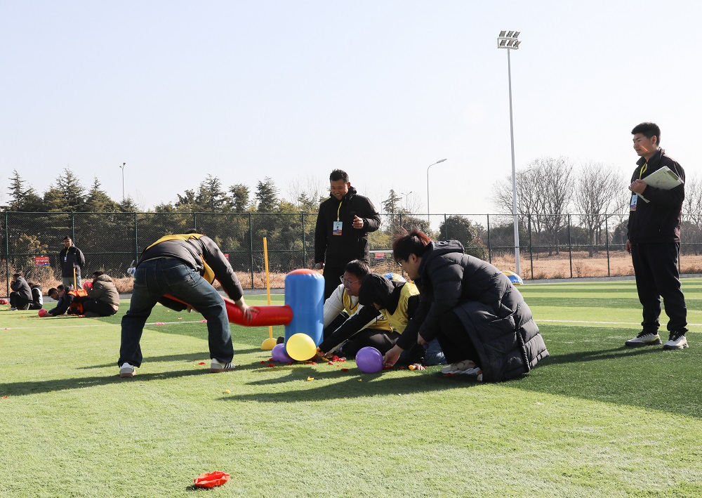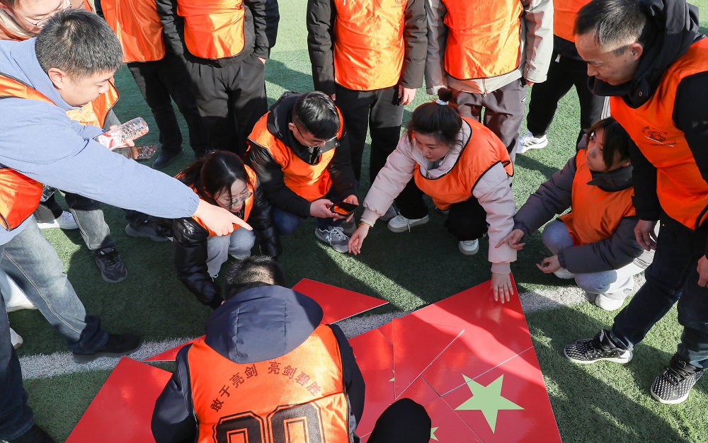 “運(yùn)轉(zhuǎn)乾坤”作為開場項(xiàng)目便點(diǎn)燃了現(xiàn)場氣氛。參賽隊(duì)員們步調(diào)一致、齊心協(xié)力,歡笑聲和加油聲此起彼伏。緊接著,“齊頭并進(jìn)”和“袋鼠運(yùn)瓜”等趣味游戲讓大家在歡快的互動中增進(jìn)彼此間的默契。“國旗拼圖”項(xiàng)目則考驗(yàn)了團(tuán)隊(duì)的智慧與協(xié)作能力,眾多隊(duì)伍在激烈的競爭中展現(xiàn)了巧妙的分工和默契的配合。