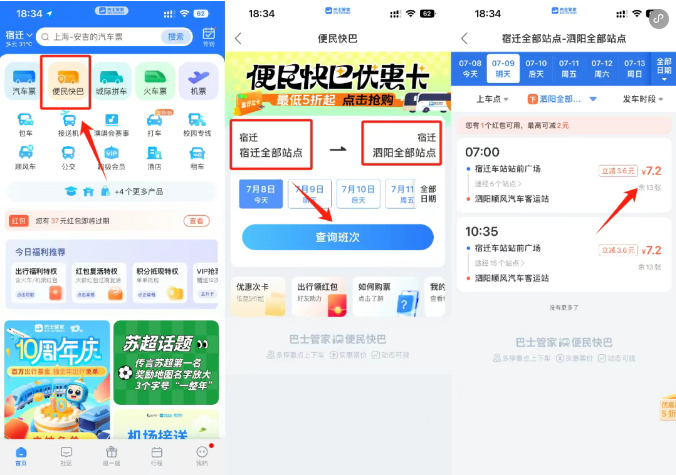 打開巴士管家APP或微信小程序,點擊首頁“便民快巴”,選擇上下車點即可購票。(