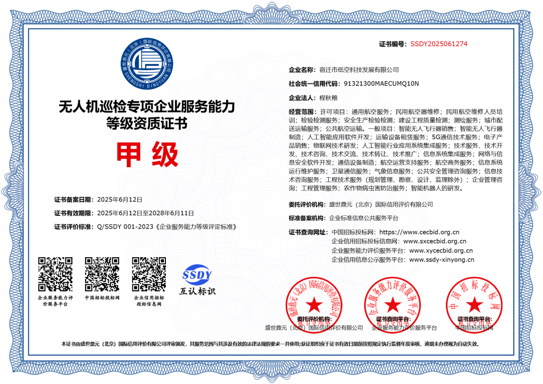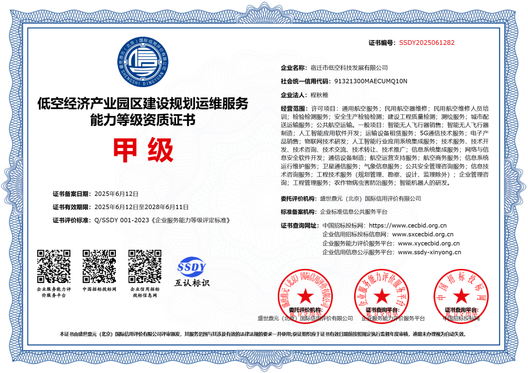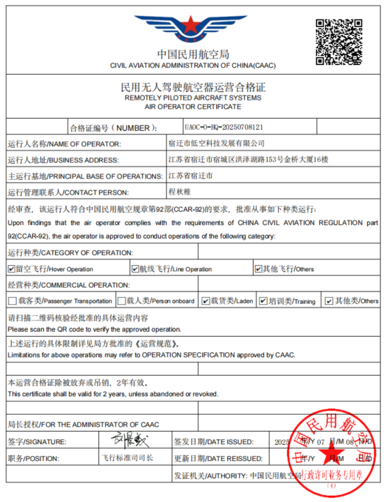 近日,低空科技公司憑借國(guó)企的責(zé)任擔(dān)當(dāng)、高效的團(tuán)隊(duì)執(zhí)行力和對(duì)低空經(jīng)濟(jì)發(fā)展趨勢(shì)的敏銳洞察,成功斬獲“民用無(wú)人駕駛航空器運(yùn)營(yíng)合格證”及低空領(lǐng)域核心資質(zhì)13項(xiàng),為公司在萬(wàn)億級(jí)新藍(lán)海中揚(yáng)帆起航奠定堅(jiān)實(shí)基礎(chǔ),也為宿遷低空經(jīng)濟(jì)產(chǎn)業(yè)高質(zhì)量發(fā)展注入強(qiáng)勁動(dòng)能。