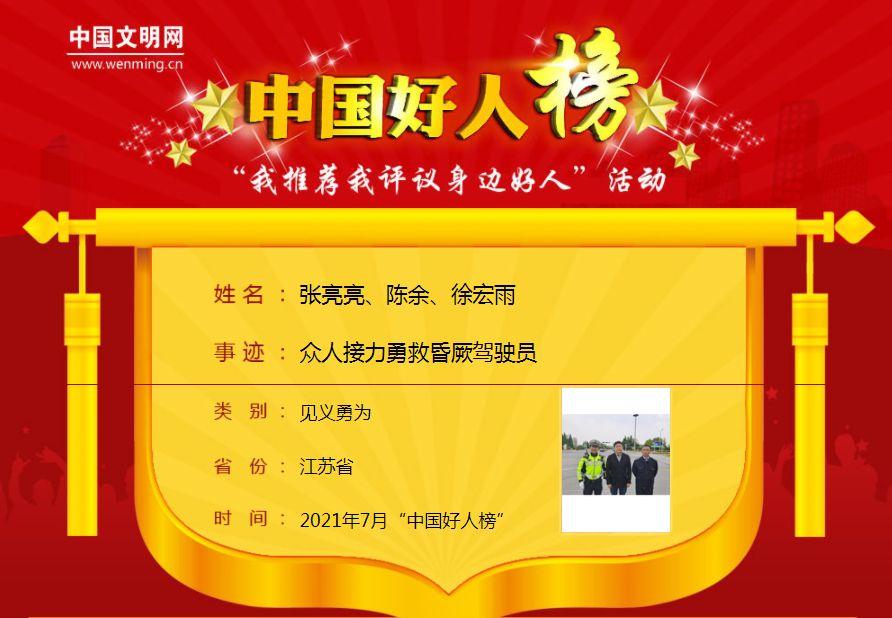 近日,中央文明辦發(fā)布2021年7月“中國好人榜”,其中,宿遷交通集團(tuán)徐宏雨入選見義勇為“中國好人”。