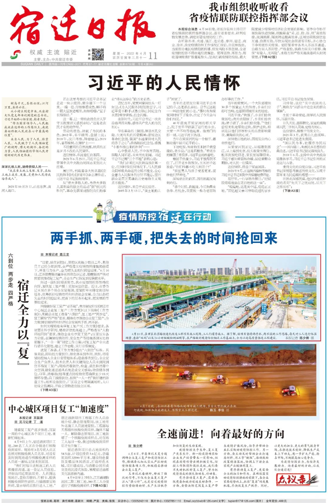 4月11日,《宿遷日?qǐng)?bào)》頭版《疫情防控宿遷在行動(dòng)》專欄聚焦集團(tuán)重點(diǎn)工程項(xiàng)目復(fù)工復(fù)產(chǎn)情況。