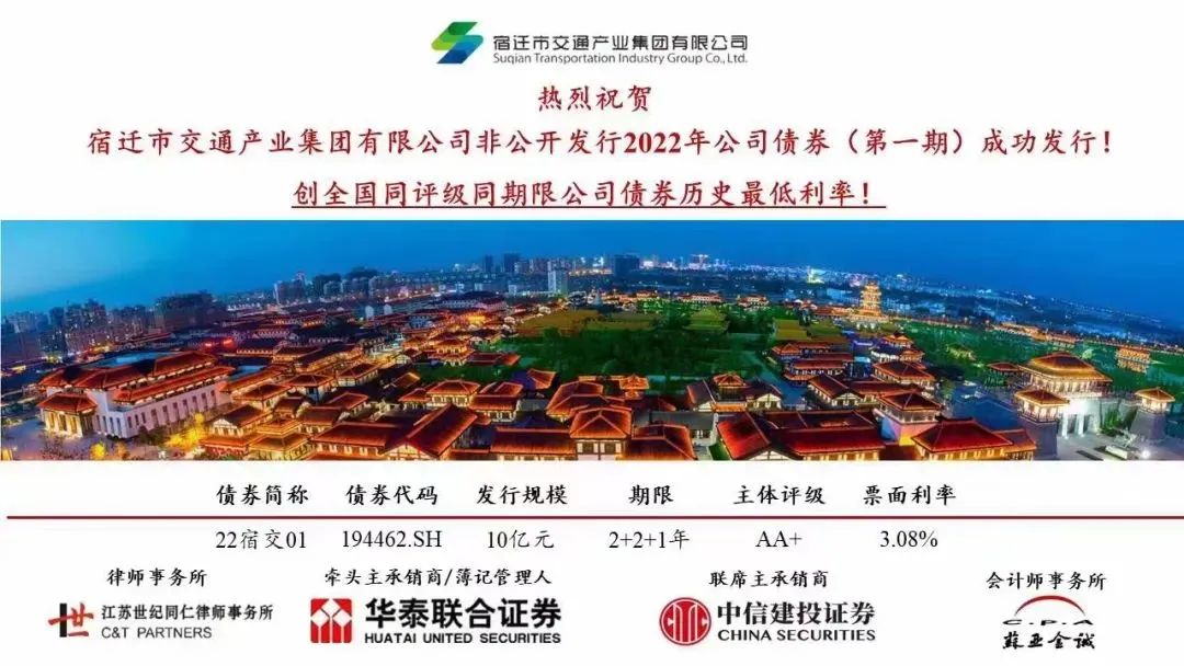 【喜訊】創(chuàng)全國(guó)最低!宿遷交通集團(tuán)非公開(kāi)發(fā)行2022年公司債券(第一期)成功發(fā)行