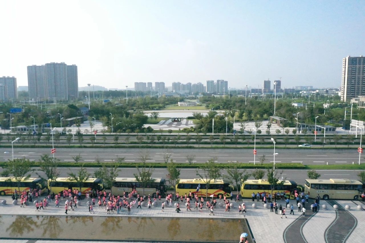 在這里,18輛由宿遷交通集團(tuán)統(tǒng)籌調(diào)度的定制公交早已整裝待發(fā),志愿者們手持車輛編號(hào)牌在車旁引導(dǎo)。